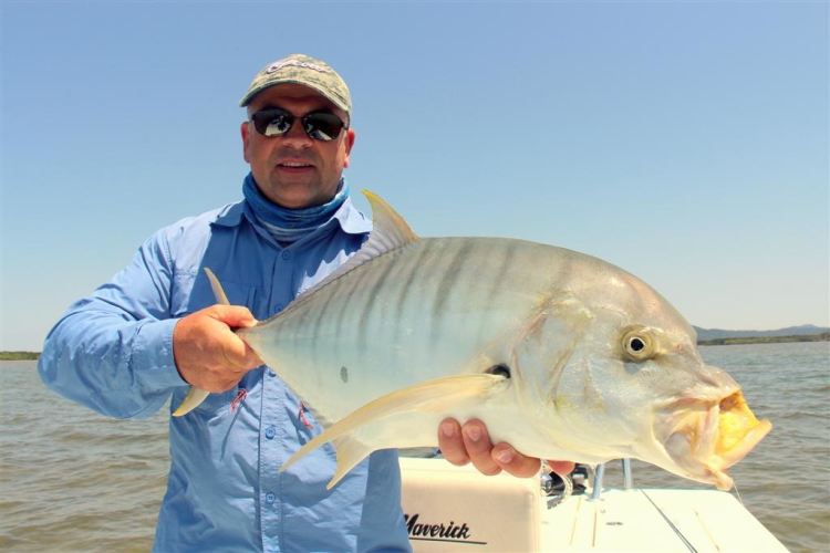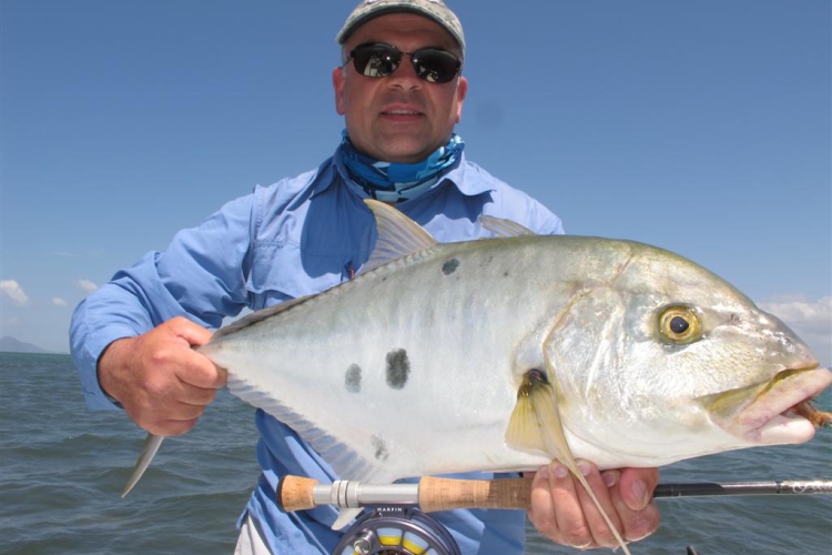Goldies are a fantastic target on the flats and in the area I fished often hang around permit. They will take a variety of flies but crabs and shrimp flies are the most popular as well as baitfish flies like Clouser Deep Minnows. At Hinchinbrook we must have had 40 or more shots at permit and could clearly see some goldies mixed in. They take a fly a little easier than permit 🙂 We get them here over a metre in length on the flats and they are just THE BEST fly rod target… If you do everything right they will take a fly well, fight hard and handle well. And they look awesome – here’s a smaller one I got, my first ever, you can see the different colouration.