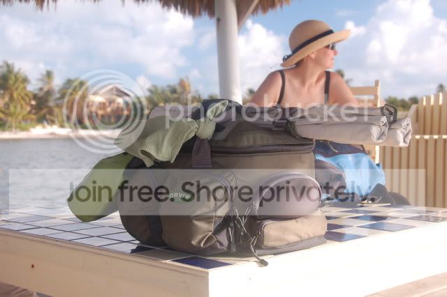 My wife awaiting the morning dive boat with my boat bag awaiting a day of fishing