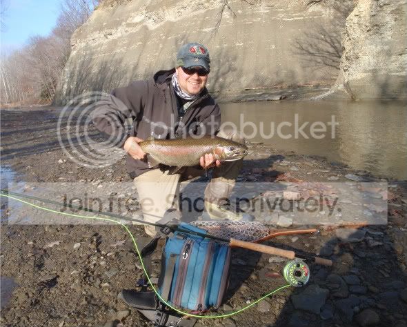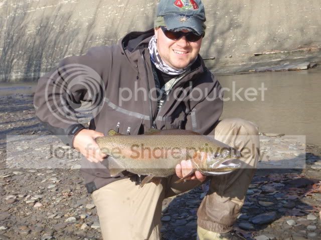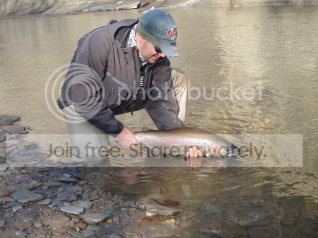 Spent the past couple of days steelheading again. Took a buddy over to fish PA. We knew it was going to be tough with the lack of water, but gave it a shot anyway. We were on the water by first light and it was game on from there. We had a nice section of water all to ourselves. In fact we never saw another angler the whole time we were fishing, very odd for a Sunday. It didn’t take long to start getting into fish. Here is the first fish of the day.
