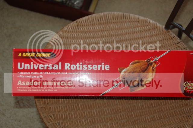 Buy a cheap universal rotisserie. IMPORTANT – you must buy this at Walmart (or somewhere equivalent) because it is only $19.95 at that location. Home Depot has the same universal device but it runs $40.95 and $55.95 for the same setup.