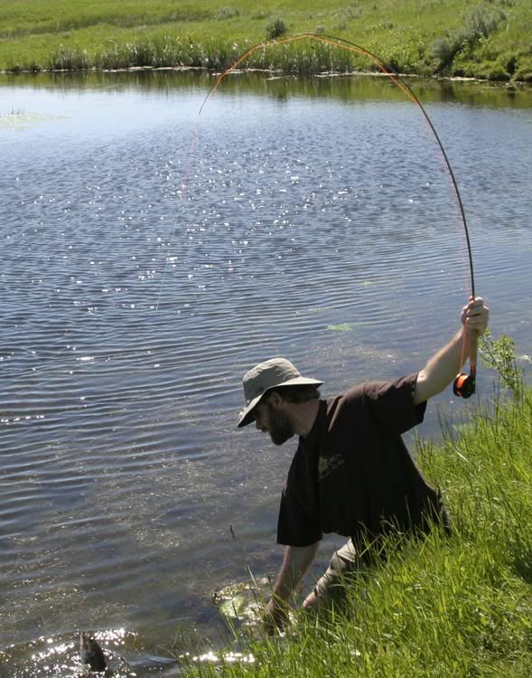 Landing a Largemouth bass with a 4 weight PMQ (Poor Man’s Quad), a rod I made with two strips of bamboo to make a quad rod, with no forms. A micrometer, plane, measuring tape, glue, varnish, clamps and hardware are about all you need. A pencil helps. Note how I’m keeping my hand back to keep the angle more open and not stress the ferrule as much. It’s still a steep angle, but only for a brief moment.