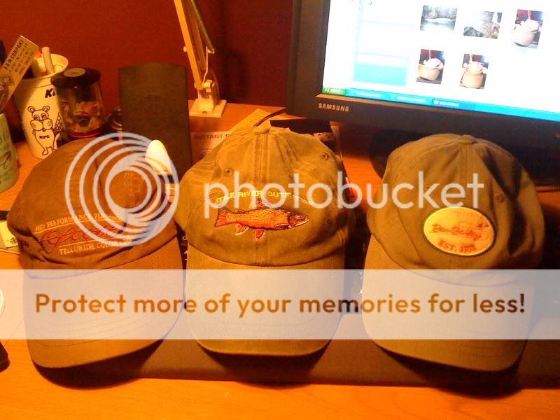 Just I got too much hot orange hats 🙂Mar 6, 2010 at 4:48 am #42824 J.T. GriffinMember J.T. GriffinMemberthe Saltwater Angler in key west has a cool hat/logo That is my all time favorite, but it’s pretty worn now. Mar 6, 2010 at 9:51 am #42825m. g. sturm MemberLittle River also has a cool cap; one with the Brookie in Sage Green. I had to go look in my hat box but, I liked the Little River Fly Shop Brookie hat so much I bought it in both the tan and the green color!!! No green Sages in this house, only Winstons!!! Mar 6, 2010 at 12:44 pm #42826lawrence underwood MemberLittle River also has a cool cap; one with the Brookie in Sage Green. I had to go look in my hat box but, I liked the Little River Fly Shop Brookie hat so much I bought it in both the tan and the green color!!! No green Sages in this house, only Winstons!!! 😆 I have them both as well. Apr 10, 2010 at 3:38 am #42827john switow MemberWith a little luck I will post these without saving to photobucket.  .  The Little River Outfitters hat is a beauty, a fine fly shop as well.  My old Waxed Scott hat, and I really like the old look of the Dan Bailey hat.  I left my Trouthunter hat over at the cabin, or it would have been in the shot as well.  I think their Osprey is the coolest. .  The Little River Outfitters hat is a beauty, a fine fly shop as well.  My old Waxed Scott hat, and I really like the old look of the Dan Bailey hat.  I left my Trouthunter hat over at the cabin, or it would have been in the shot as well.  I think their Osprey is the coolest.
