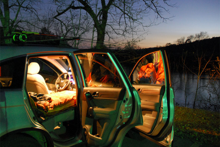 See, I’ve figured out how to lay out my seats so I can make a flat sleeping surface. It was in the 30s at night but I was plenty comfortable in my zero degree sleeping bag.
