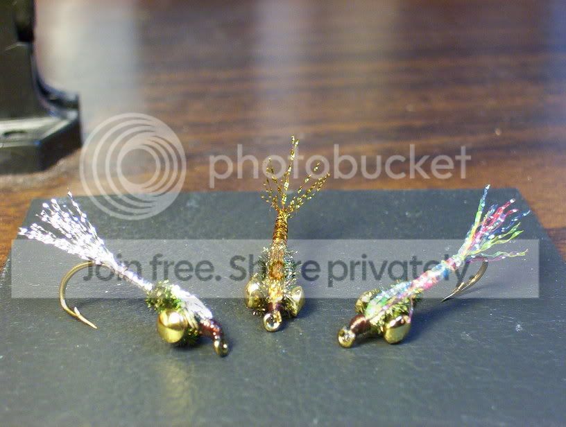 Haven’t tried these yet but they year is young. BUt they are too big to be midges so fry they stay as.The Damsel above has so far proven to be a good stillwater trout fly but when soakeda and on active retrive it flipped because of those glass dumbell eyes.