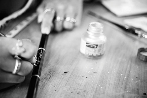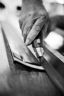 But first come decals. Some companies use stickers, while others continue to hire trained calligraphers (who must all have close to the same handwriting) to write on blanks. Any alignment dots (witness marks), decorative wraps, inlays or other “jewelry” would also be placed at this time.